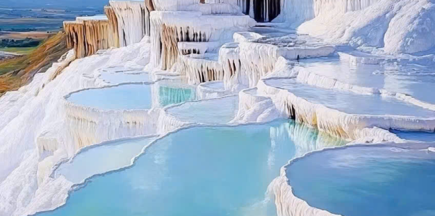 - Tiếp tục đến với Pamukkale (~400km, ~5 giờ di chuyển) – Đây là một điểm đến hấp dẫn nhất nhì Thổ Nhĩ Kỳ bởi vẻ đẹp khó tin chỉ xuất hiện trong những bộ phim khoa học viễn tưởng của nó. Nếu chỉ nhìn trên ảnh hay những thước phim từ trên cao, người ta dễ nhầm lẫn đây là một núi tuyết khổng lồ nhưng thật ra đó chính là một vùng núi đá vô canxi cacbonic được tích tụ hàng nghìn năm với hình dáng như những hồ nước xếp thành từng tầng được tạo thành bởi quá trình biến đổi. Nước trong những “hồ bông” này là nước khoáng tự nhiên được hình thành từ mạch khoáng ngầm với màu xanh da trời và chứa nhiều khoáng chất có lợi cho sức khỏe và có thể hỗ trợ chữa bệnh. Ở Pamukkale có đến 17 suối nước nóng với nhiệt độ từ 35 – 100 độ nên từ lâu người ta đã biết tận dụng để mở các dịch vụ spa, nghỉ dưỡng để phục vụ du khách.