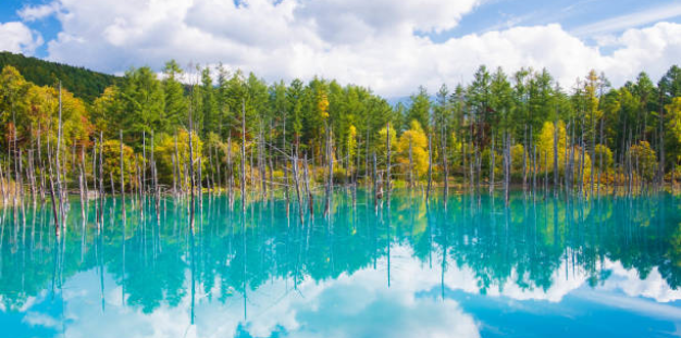 - Hồ Shirogane Blue Pond – Viên ngọc xanh thẳm của thành phố Biei được xây dựng vào năm 1988 như một phần của hệ thống kiểm soát lũ lụt sau khi núi lửa Tokachi phun trào. Điều đặc biệt của hồ chính là màu nước xanh như ngọc, tựa như một bức tranh thủy mặc. Màu sắc này là do sự hòa quyện của các khoáng chất tự nhiên, đặc biệt là nhôm hydroxit keo, có tác dụng làm phân tán ánh sáng, tạo nên sắc thái xanh tuyệt đẹp cho hồ.